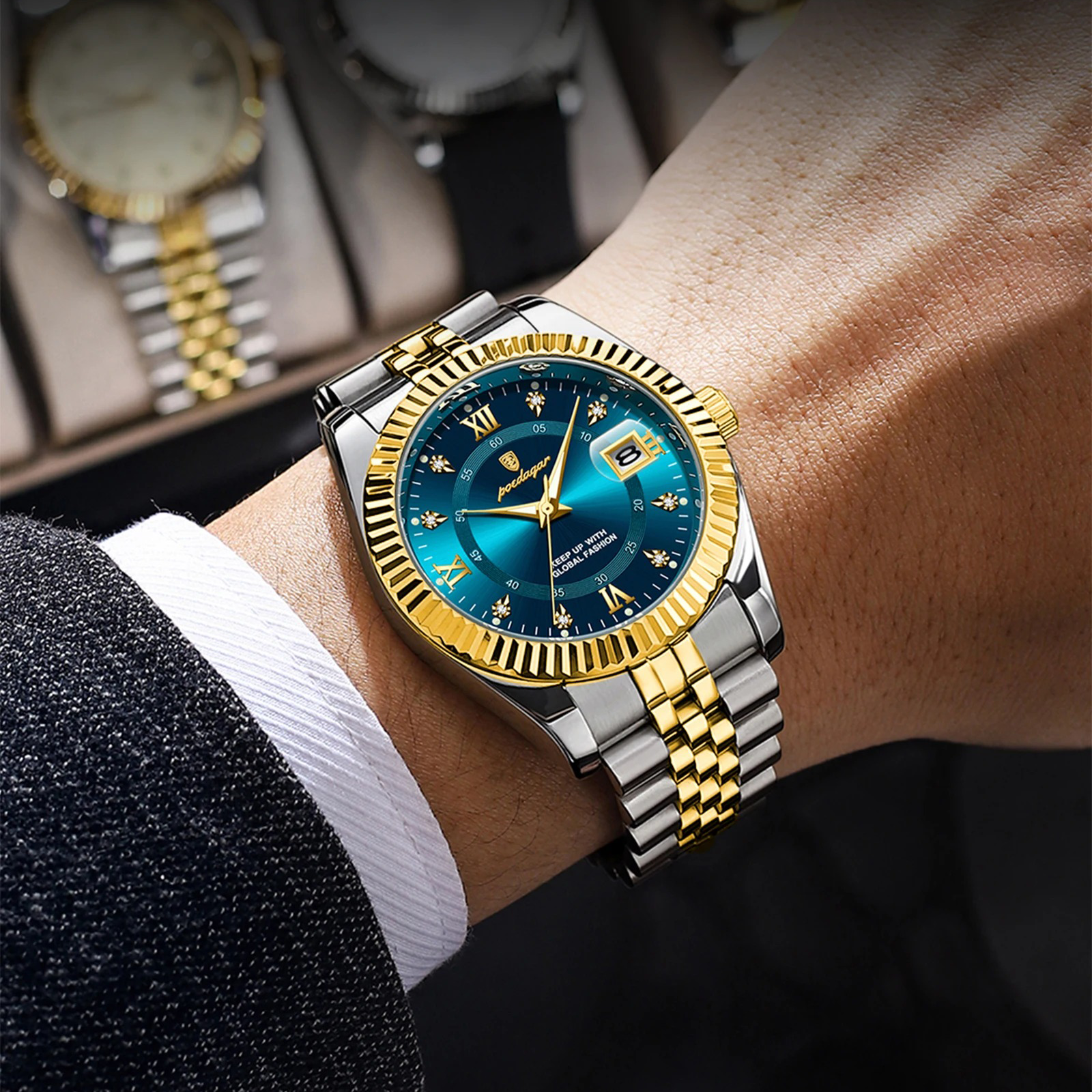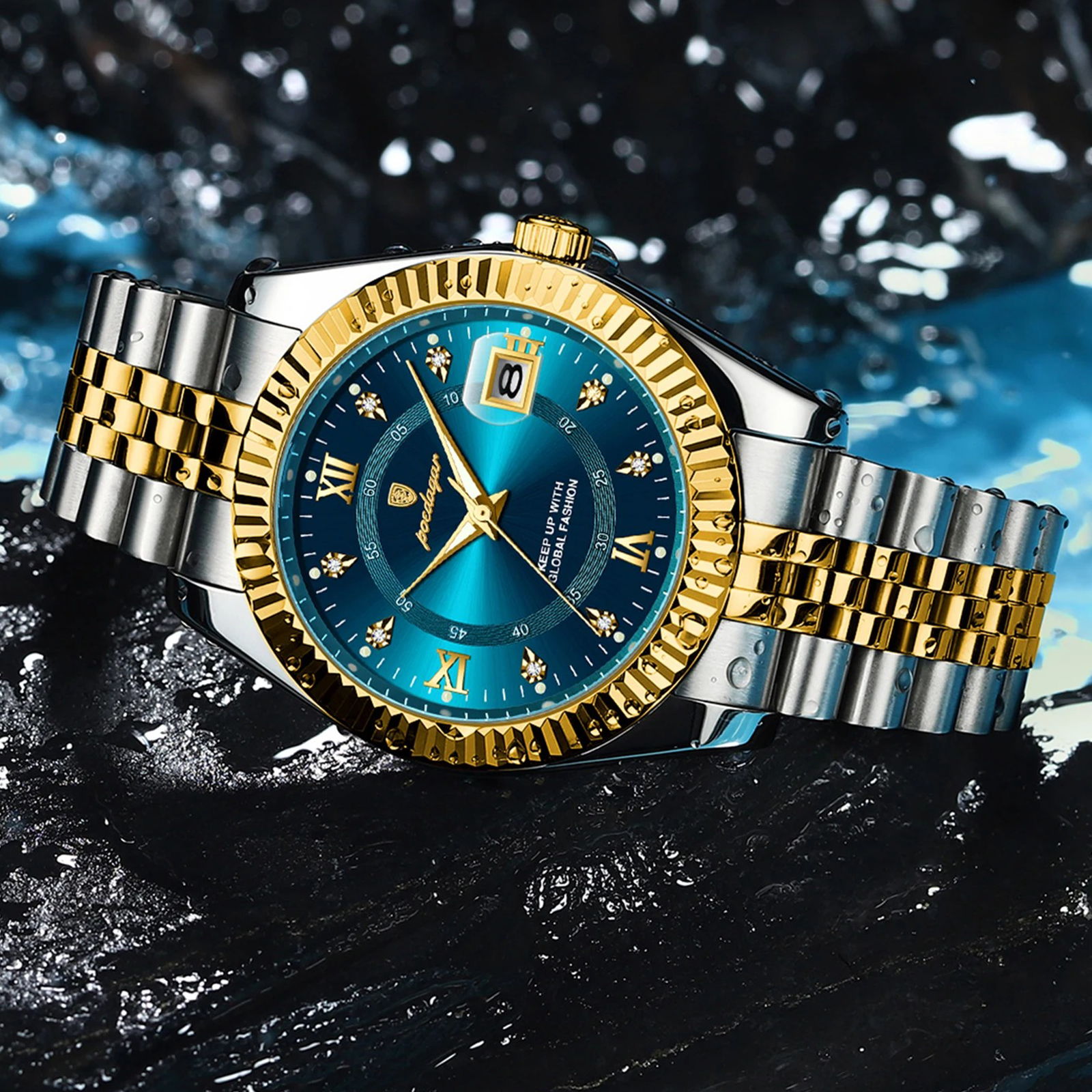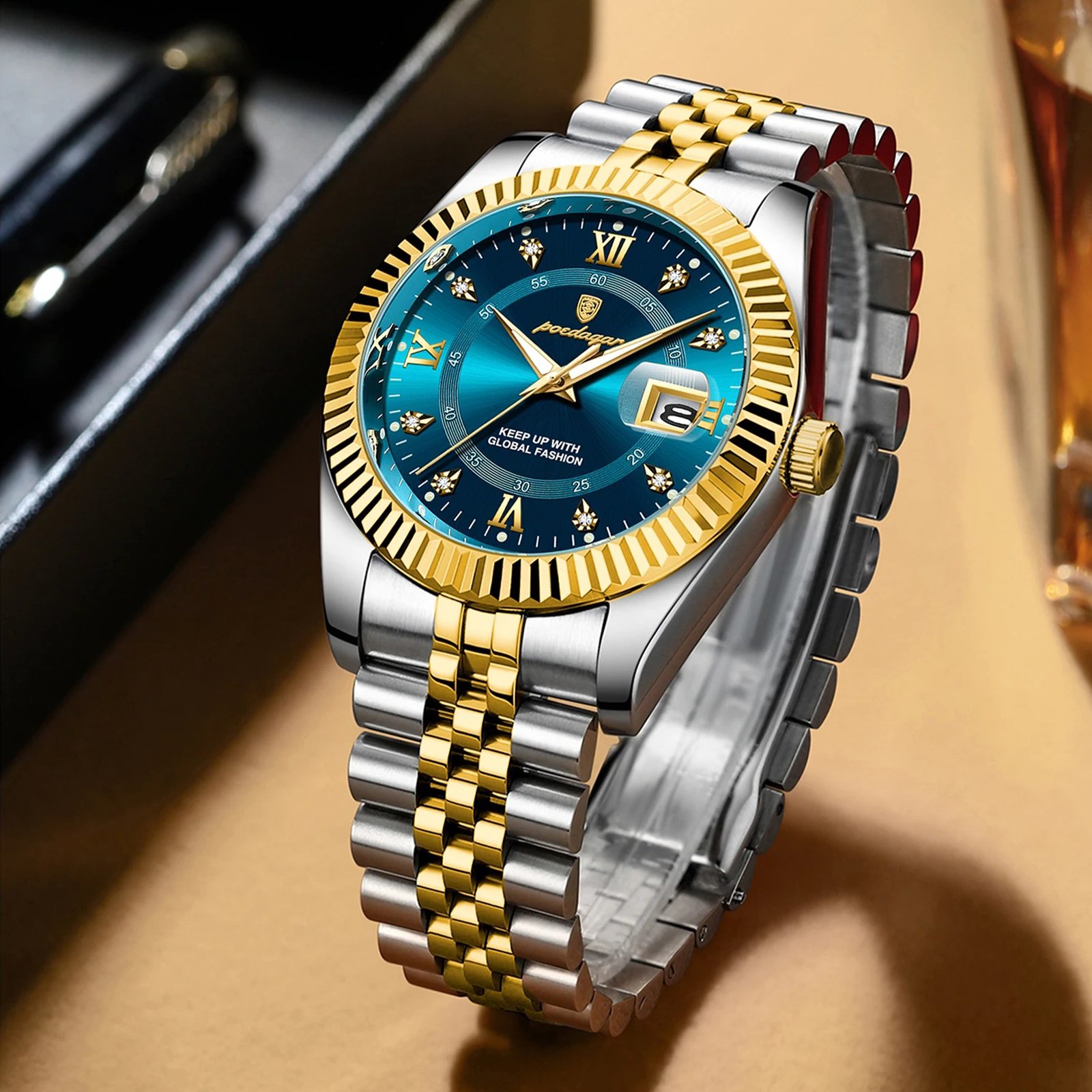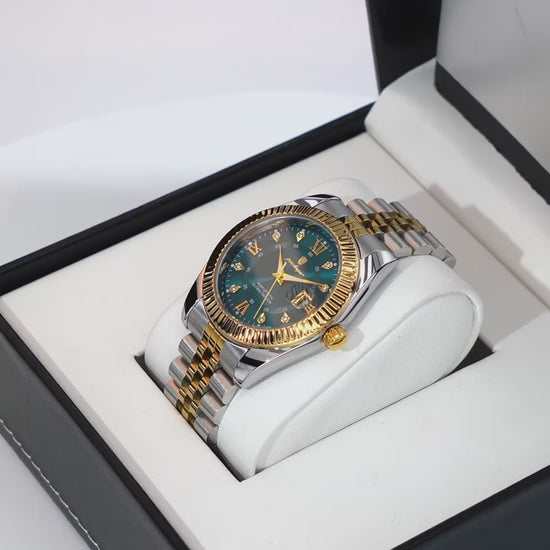Refined two-tone timepiece with a deep turquoise dial and classic Roman accents. Elegant, balanced, and effortlessly distinguished.
