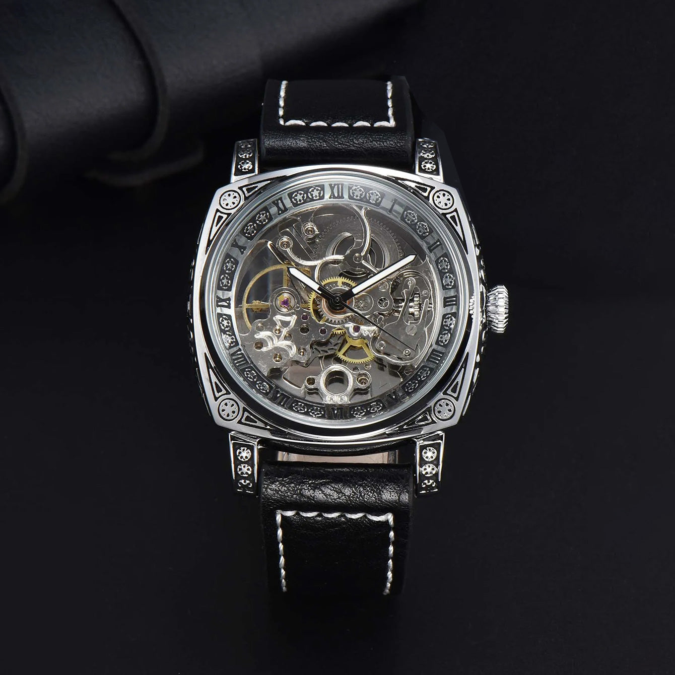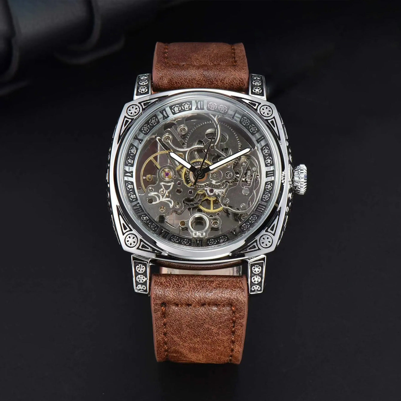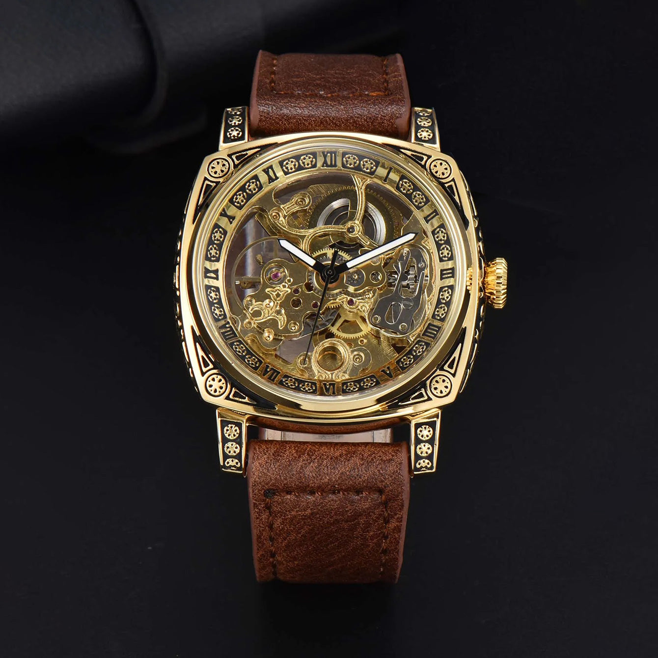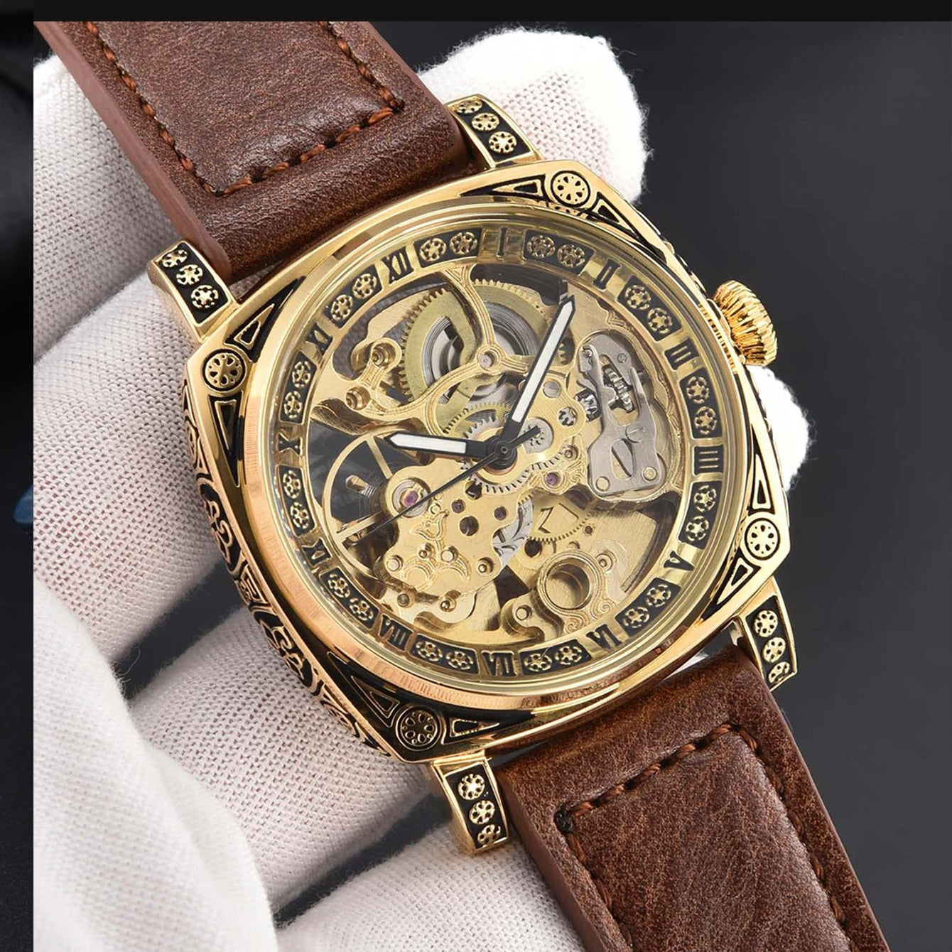 The "Cronolux" Watch is a tribute to vintage elegance and mechanical mastery. With its ornately engraved case and hand-stitched leather strap, the Cronolux blends a bold retro aesthetic with timeless sophistication.