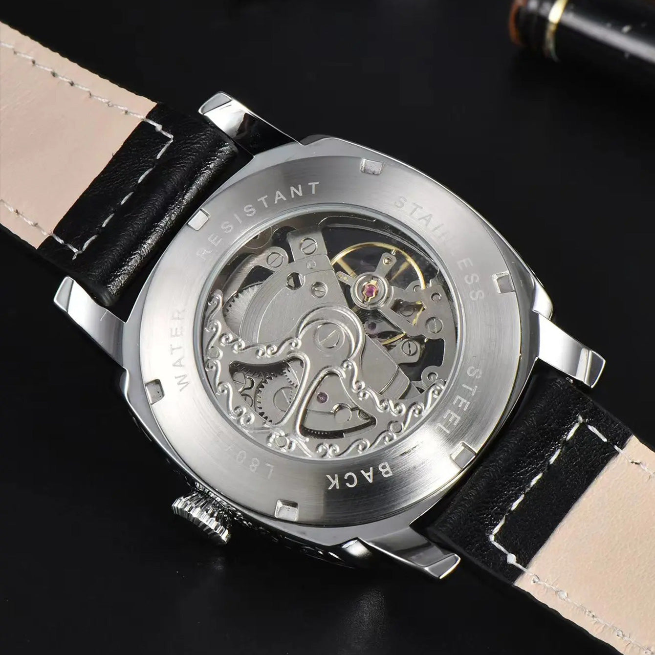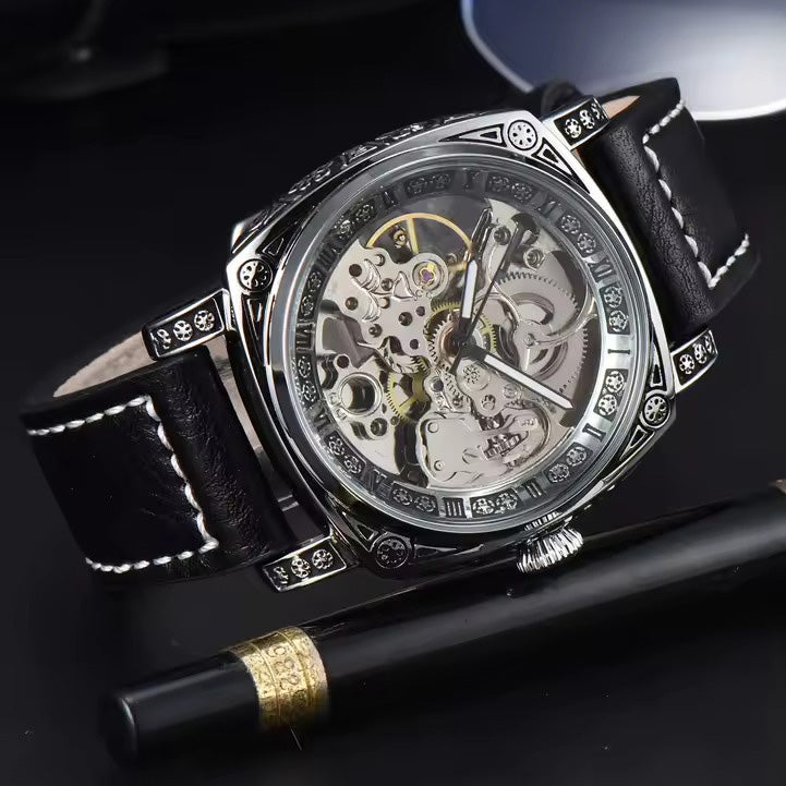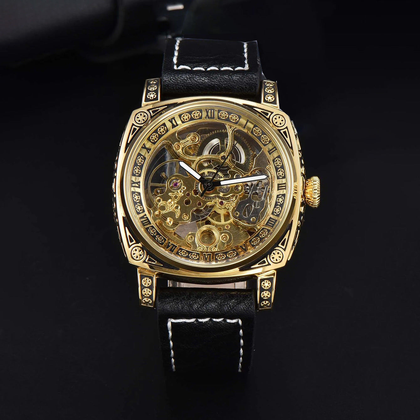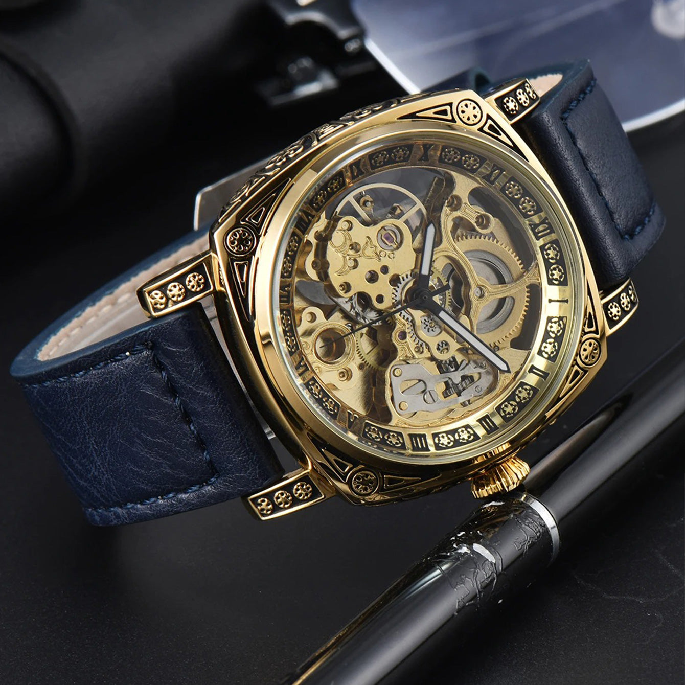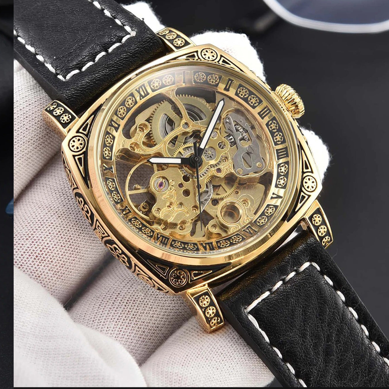 The "Cronolux" Watch is a tribute to vintage elegance and mechanical mastery. With its ornately engraved case and hand-stitched leather strap, the Cronolux blends a bold retro aesthetic with timeless sophistication.